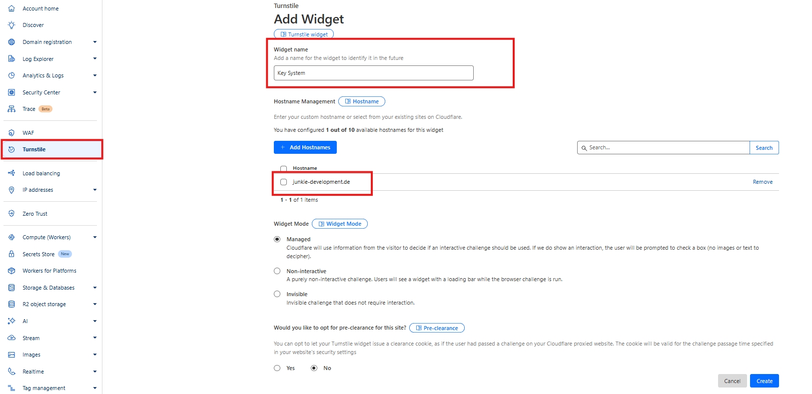 Click "Add Widget" to create a new Turnstile widget.